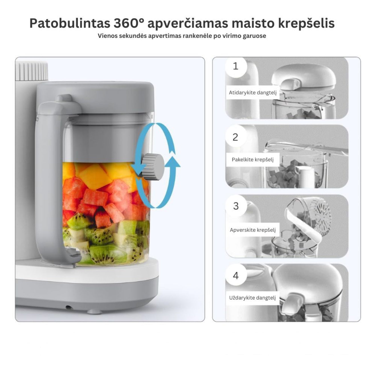 - Pagerintas 360° apverčiamas garinimo krepšelis – leidžia atlikti visą procesą be papildomų žingsnių, pvz., atvėsinimo ar krepšelio išėmimo. Tinka tėvams, norintiems vienu metu prižiūrėti kūdikį ir ruošti maistą.