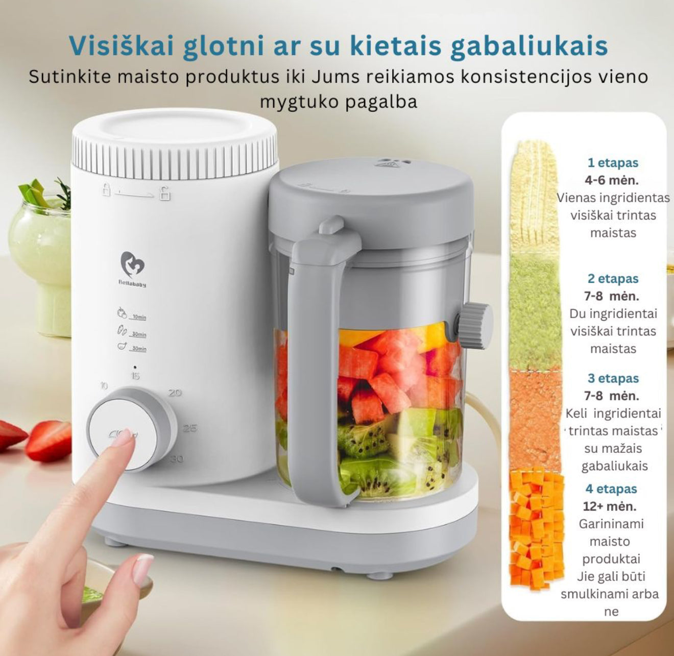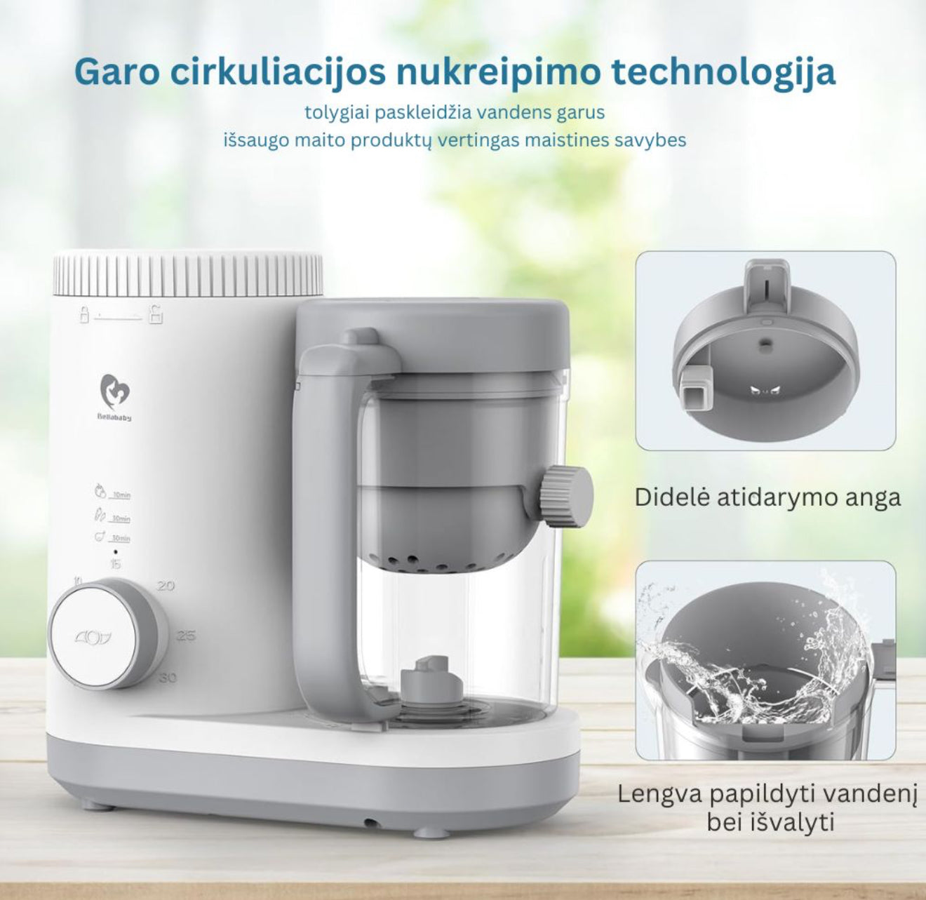 Bellababy One Step – multifunkcinis kūdikio maisto paruošimo įrenginys, sujungiantis garinimo ir maišymo funkcijas viename. Jis leidžia greitai ir patogiai paruošti sveikus bei skanius patiekalus mažyliui – nuo garintų daržovių iki šviežių vaisių ar mėsos. Su unikaliu 360° apverčiamu garinimo krepšeliu ir vieno mygtuko veikimu šis prietaisas suteikia galimybę maistą ruošti paprastai, saugiai ir efektyviai.