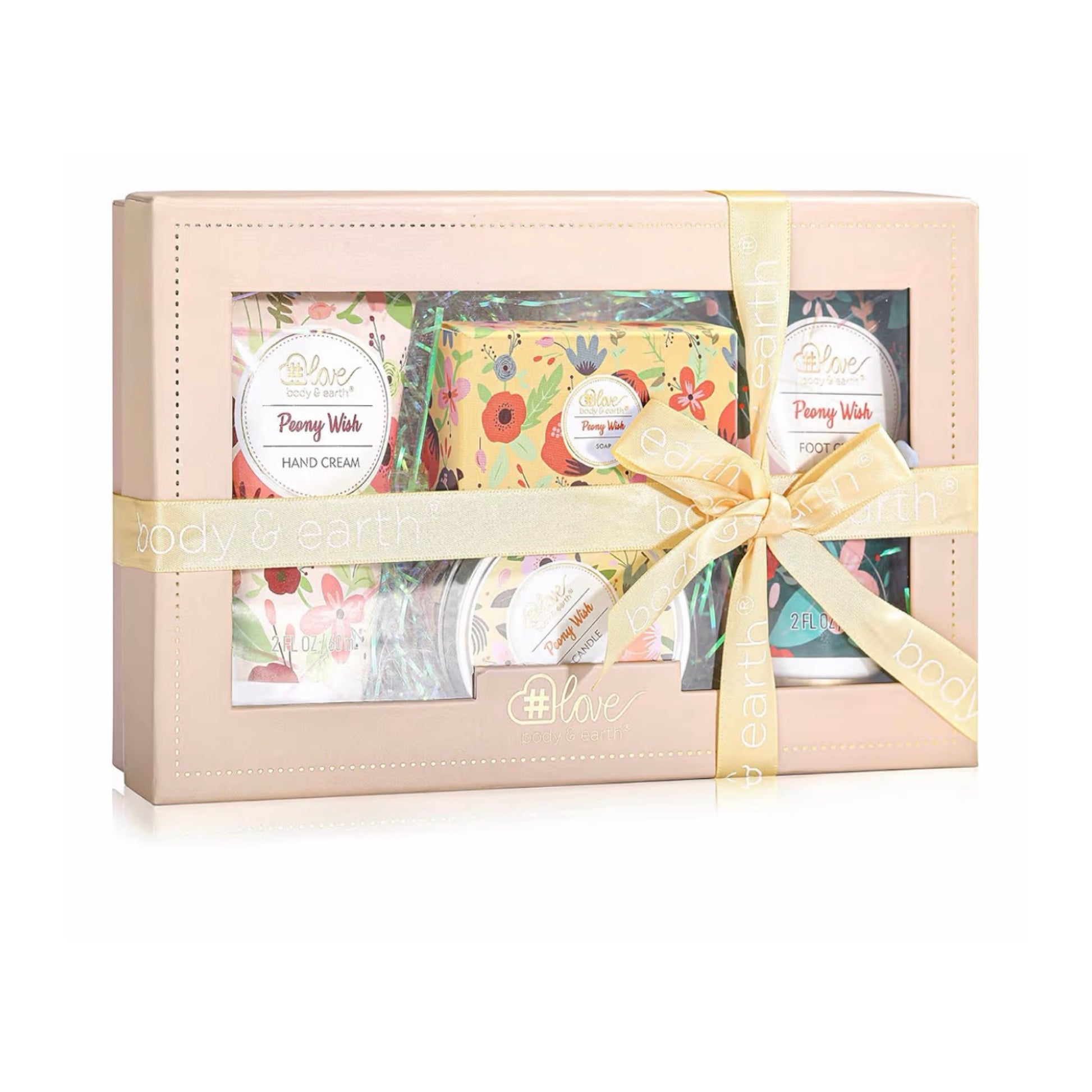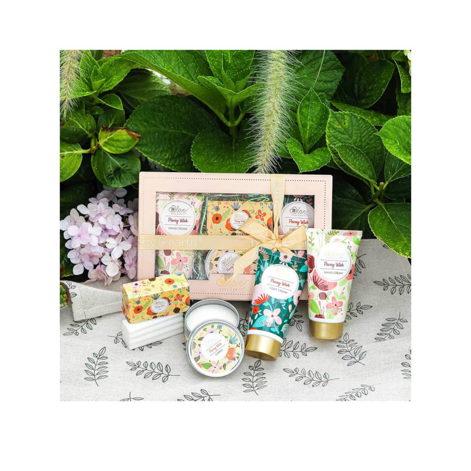 Body & Earth „Love“ dovanų rinkinys moterims – 4 dalių odos priežiūros ir aromaterapijos rinkinys su bijūnų kvapu