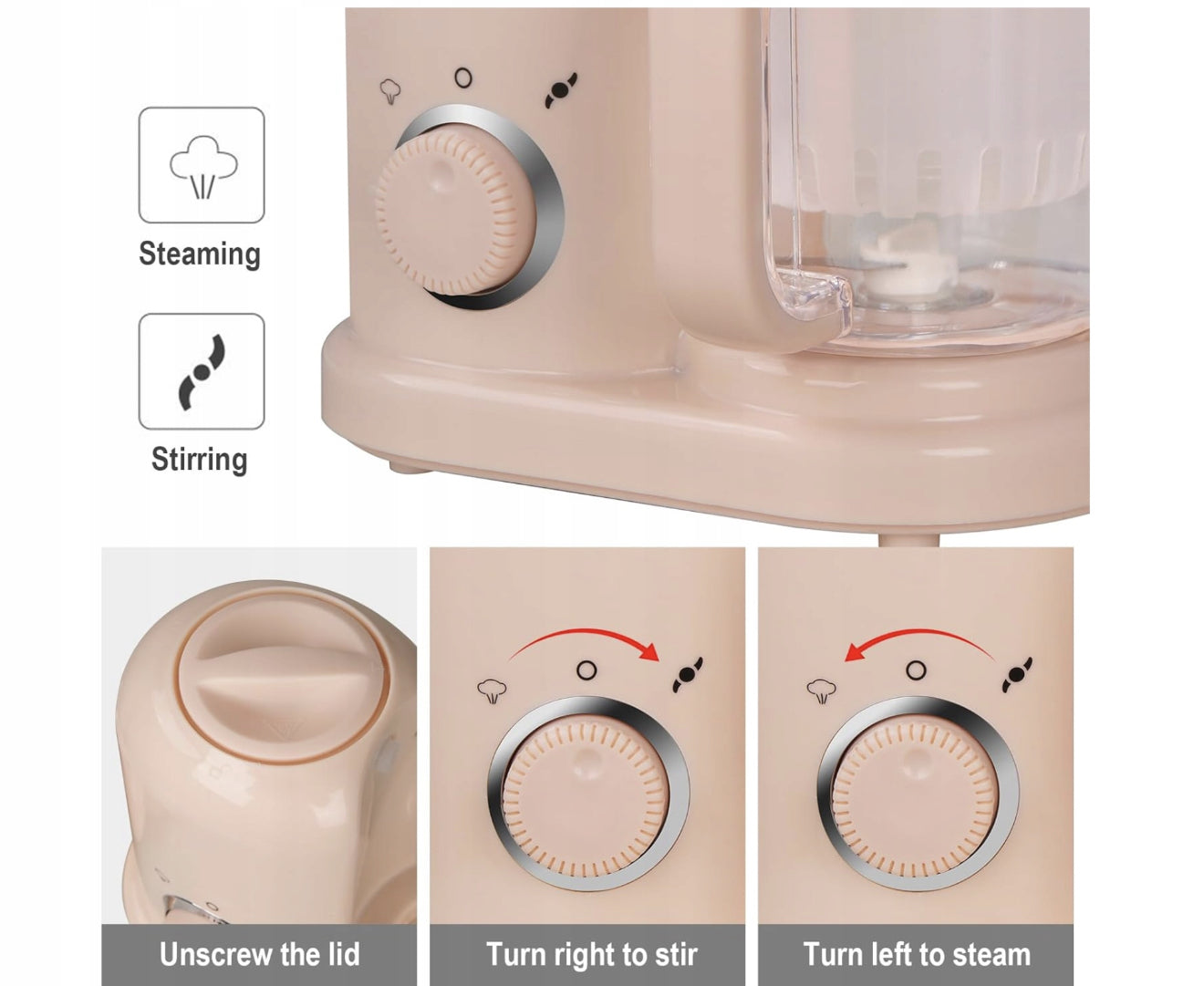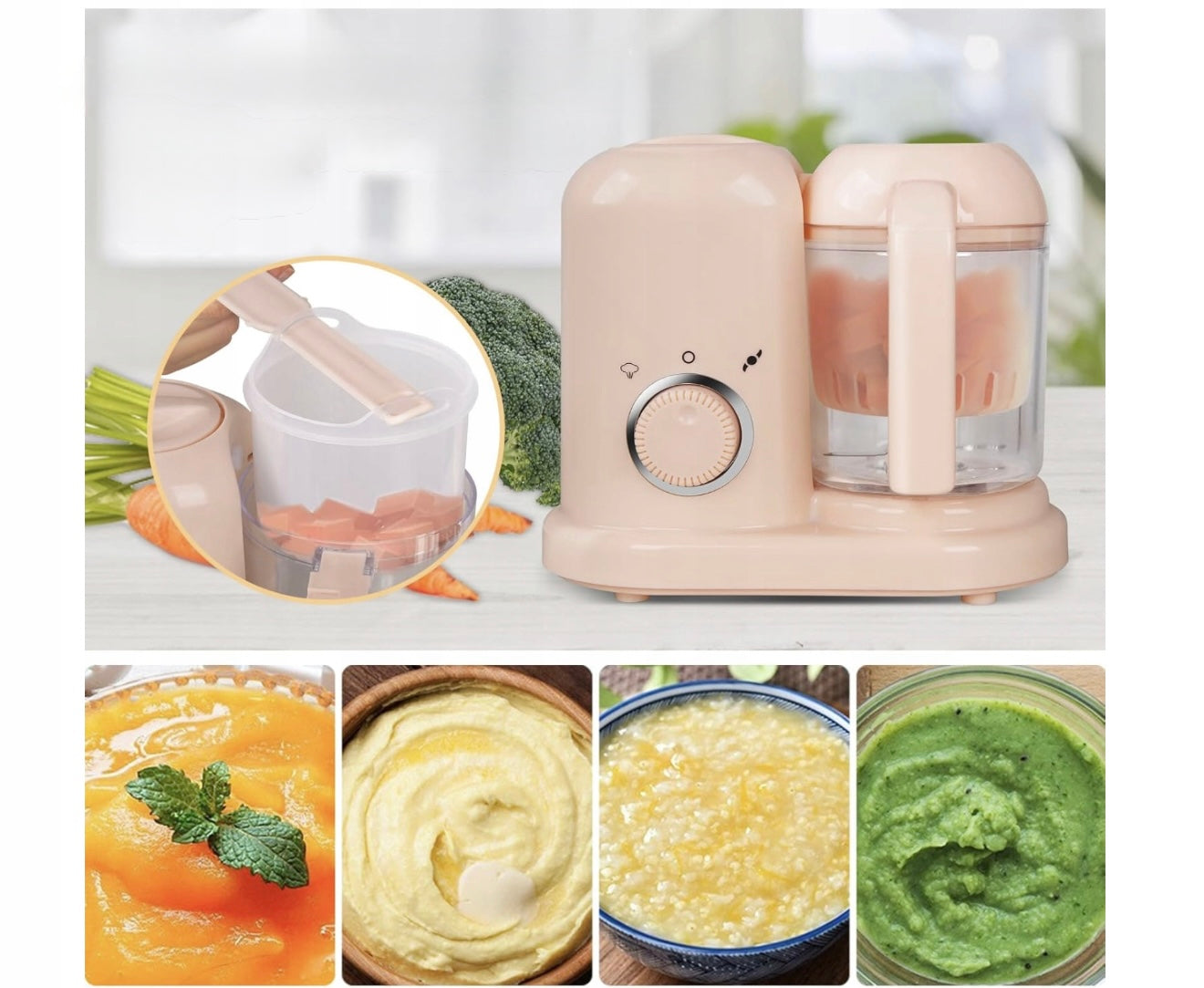 Šis 4in1 maisto ruošimo kombainas viename įrenginyje sujungia garinimo, maišymo, šildymo ir atitirpinimo funkcijas. Juo lengvai paruošite daržovių, vaisių, žuvies ar mėsos patiekalus kūdikiui – vos per kelias minutes.