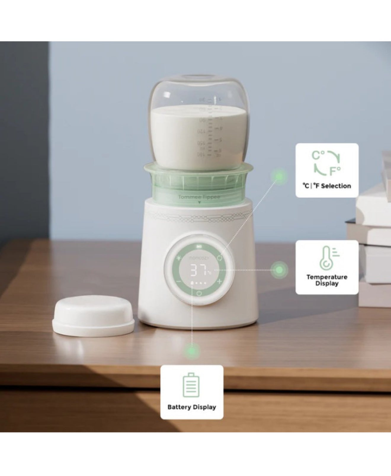 Visada šiltas pienas ar maistas – kad ir kur būtumėte! MOMCOZY įkraunamas kelioninis buteliukų šildytuvas – tai modernus, kompaktiškas ir belaidis sprendimas, praversiantis tiek namuose, tiek kelionėse. Ergonomiškas dizainas lengvai telpa į mamos rankinę, o galingas veikimas užtikrina, kad pienas ar maistas bus pašildytas greitai ir saugiai.