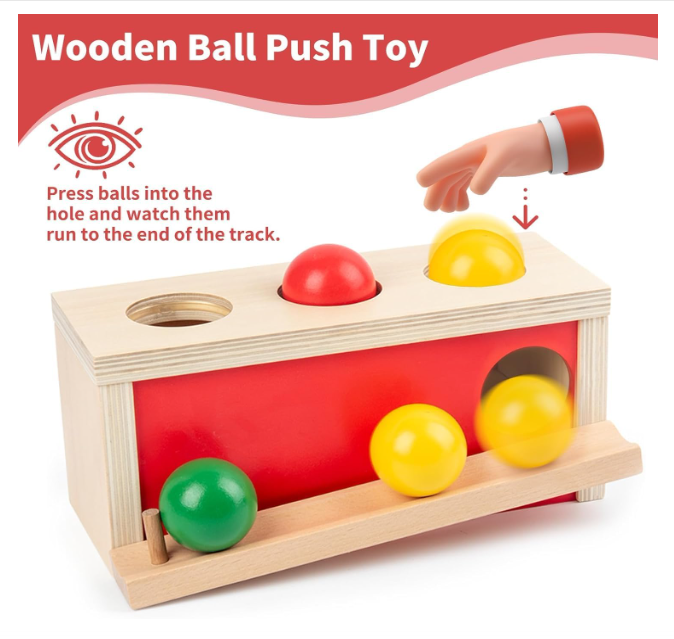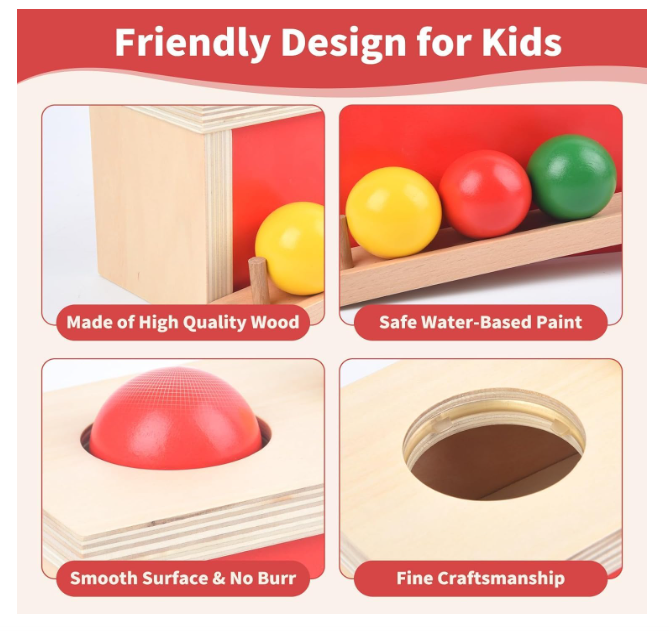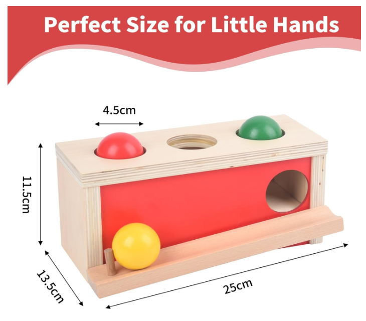 Ši medinė objektų pastovumo dėžutė padeda vaikui suprasti, kad daiktai neišnyksta, net kai jų nematyti. Įdėjus kamuoliuką į angą ir jį paspaudus, jis nurieda takeliu – vaikas stebi, kaip kamuoliukas „dingsta“ ir vėl pasirodo.