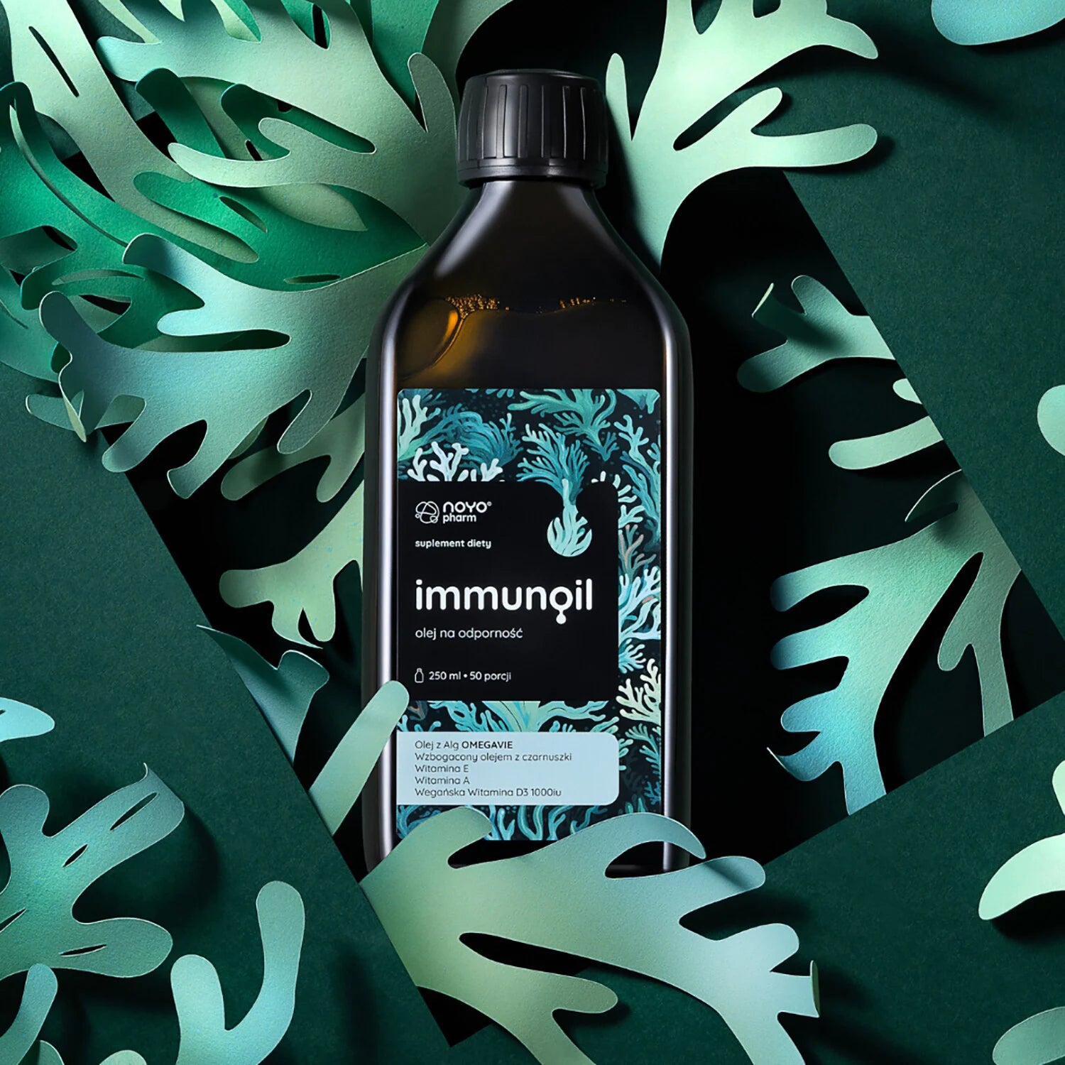 NOYO Immun Oil – tai skystas maisto papildas, skirtas imuniteto stiprinimui ir bendrai organizmo apsaugai. Jo sudėtyje – kruopščiai atrinkta omega 3, 6 ir 9 riebalų rūgščių kompozicija iš keturių augalinių aliejų: juodgrūdžių (juodųjų kmynų), dumblių, saulėgrąžų ir linų, papildyta vitaminais A, D ir E.