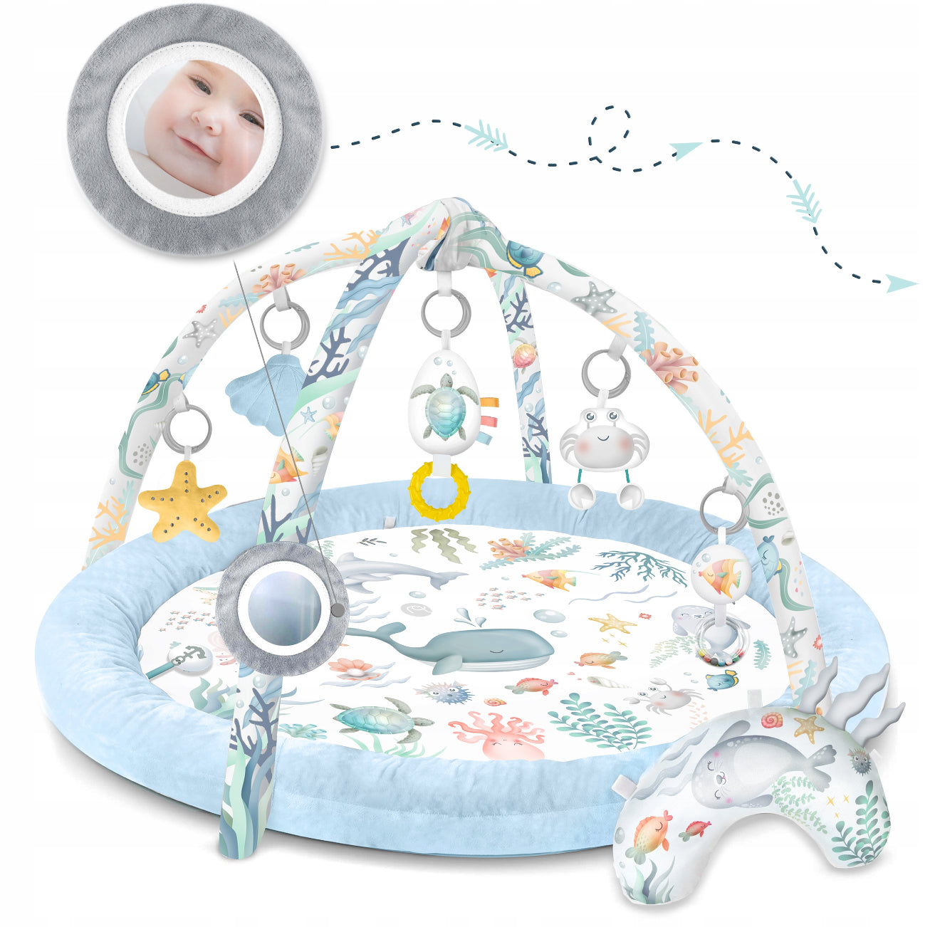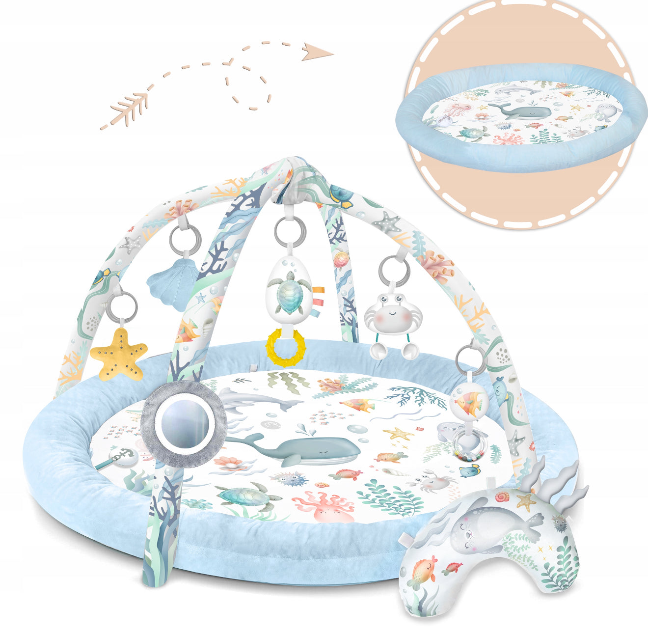- Pilnas komplektas – kilimėlis su 7 multifunkciniais žaislais, nuimamais lankais ir minkšta pagalvėle gulėjimui ant pilvuko.