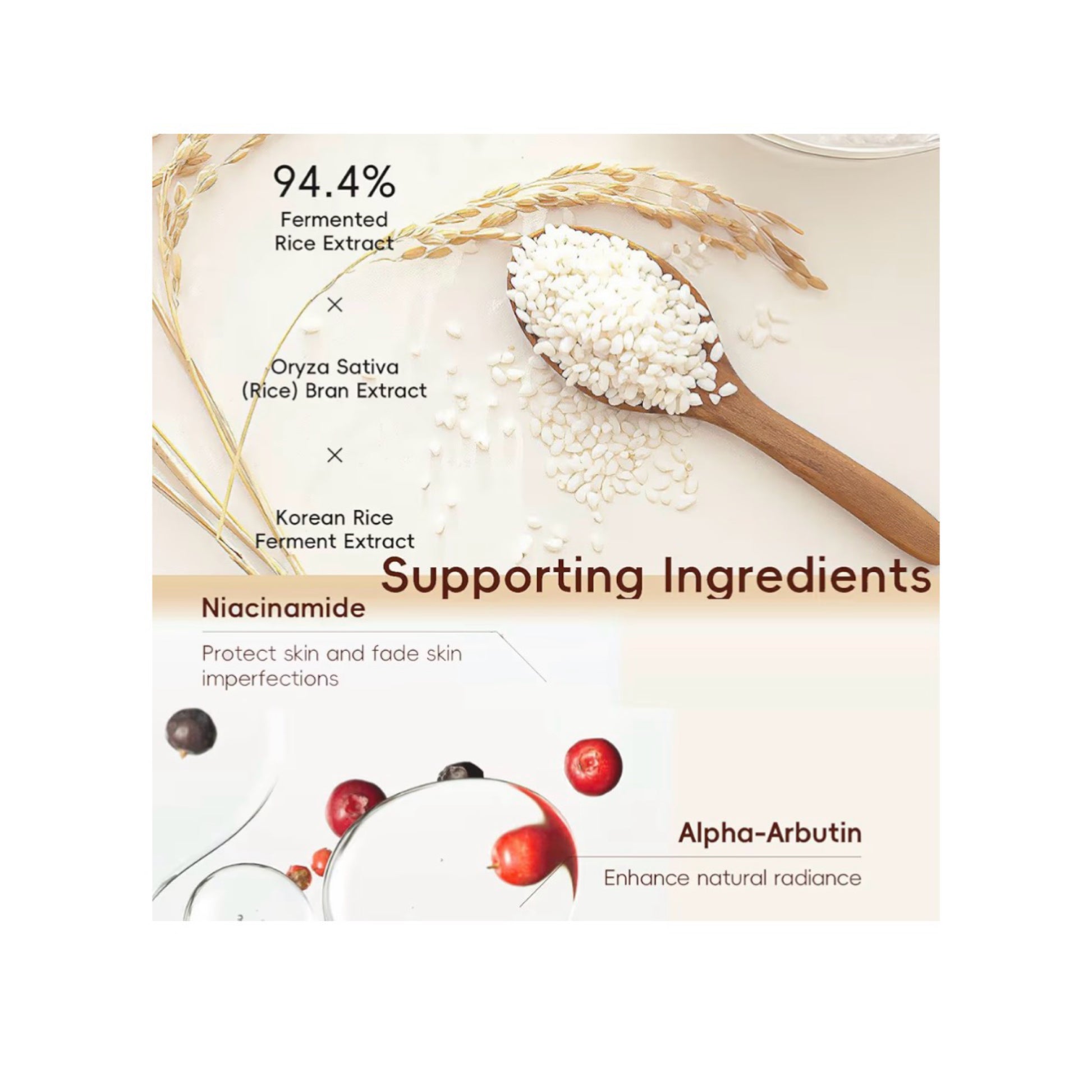 Ryžių ekstraktas, vitaminas E, hialurono rūgštis, niacinamidas, alfa-arbutinas – padeda drėkinti, raminti ir puoselėti odą kasdienėje rutinoje.