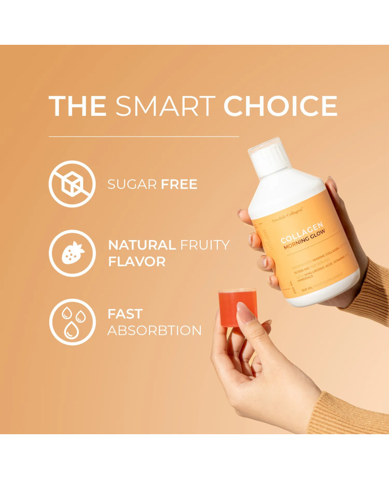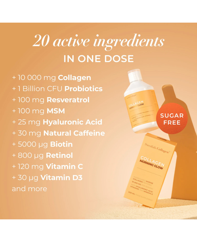 „Swedish Collagen Morning Glow“ – tai pažangi skysta grožio formulė, kurioje vienoje 25 ml porcijoje yra 10 000 mg hidrolizuoto jūrinio kolageno (I & III tipai), hialurono rūgštis, biotinas, probiotikai, kofeinas, B-kompleksas, vitaminai ir mineralai. Sukurta palaikyti odos stangrumą, plaukų ir nagų tvirtumą, žarnyno bei imuninės sistemos sveikatą – idealiai tinka kaip kasdienis rytinis grožio papildas.