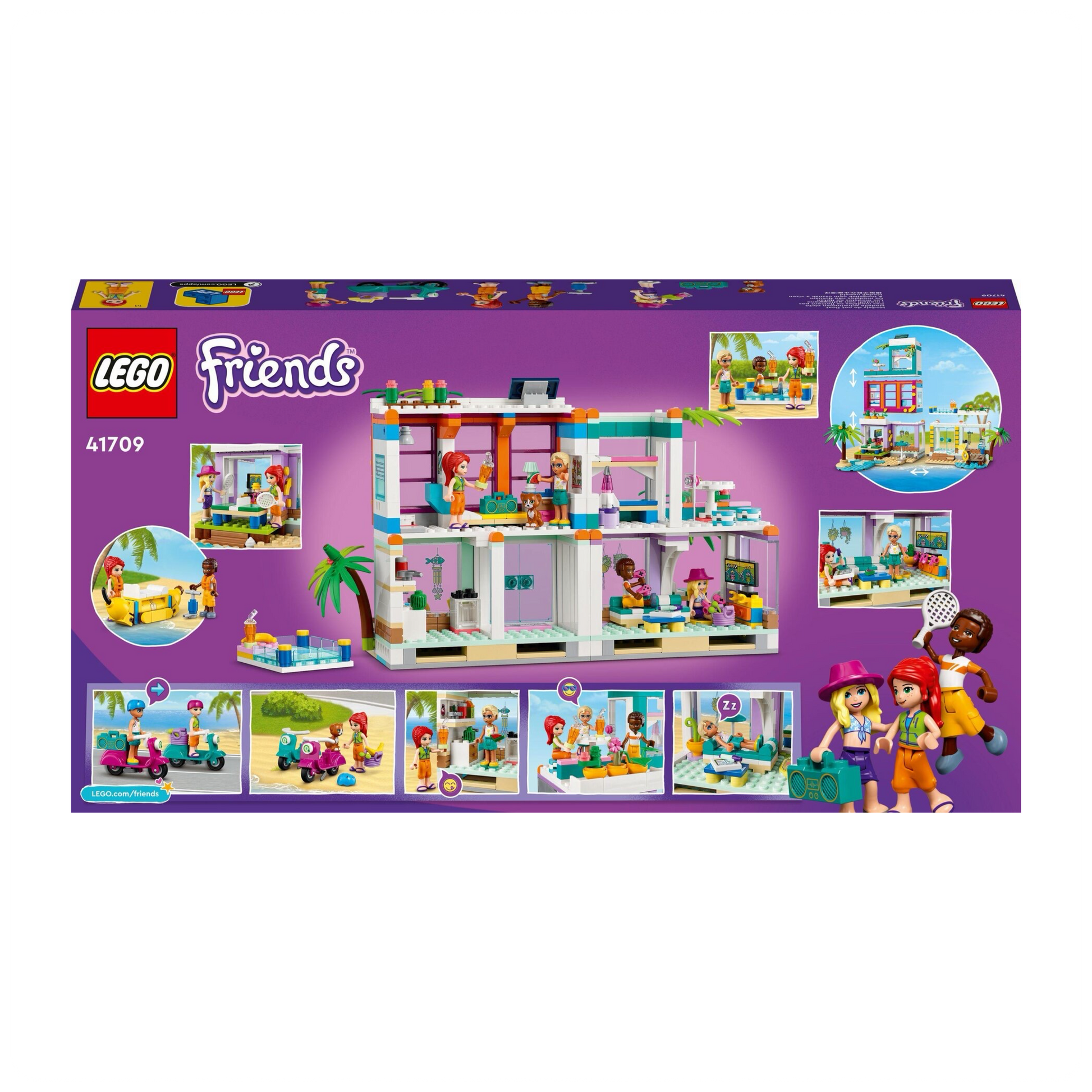 LEGO® Friends Atostogų paplūdimio namelis (41709) leis vaikams nuo 7 metų pasinerti į nuostabias atostogų akimirkas. Šis spalvingas rinkinys kupinas įdomių funkcijų ir žaislų, leidžiančių atkurti smagias pajūrio scenas. Name yra du miegamieji (vienas su vonios kambariu ir tualetu), balkonas, baseinas ant stogo, virtuvė ir svetainė. Lauke laukia stalo tenisas, prieplauka ir pripučiama banana valtis, skirta vilkti vandeniu – tikros bangų pramogos! Visos šios atrakcijos skirtos keturioms LEGO Friends mini-lėlėms.