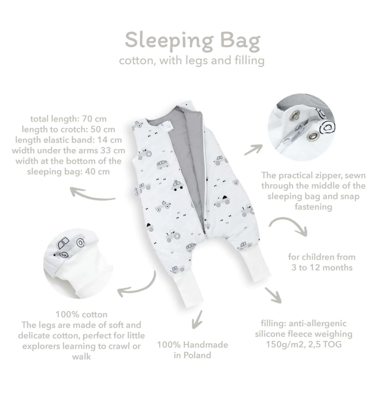 Pehme ja soe jalgadega beebimagamiskott, mis on valmistatud 100% kvaliteetsest puuvillast. Sisemus on täidetud allergiavastase silikoonvatiga (150 g/m²), mis tagab optimaalse soojusmugavuse aastaringselt.