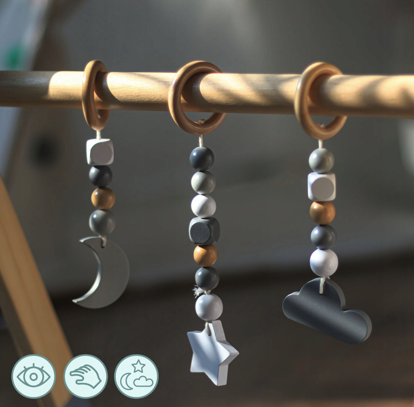 - 3 sensoorse rippuva mänguasjaga (pilv, kuu, täht).