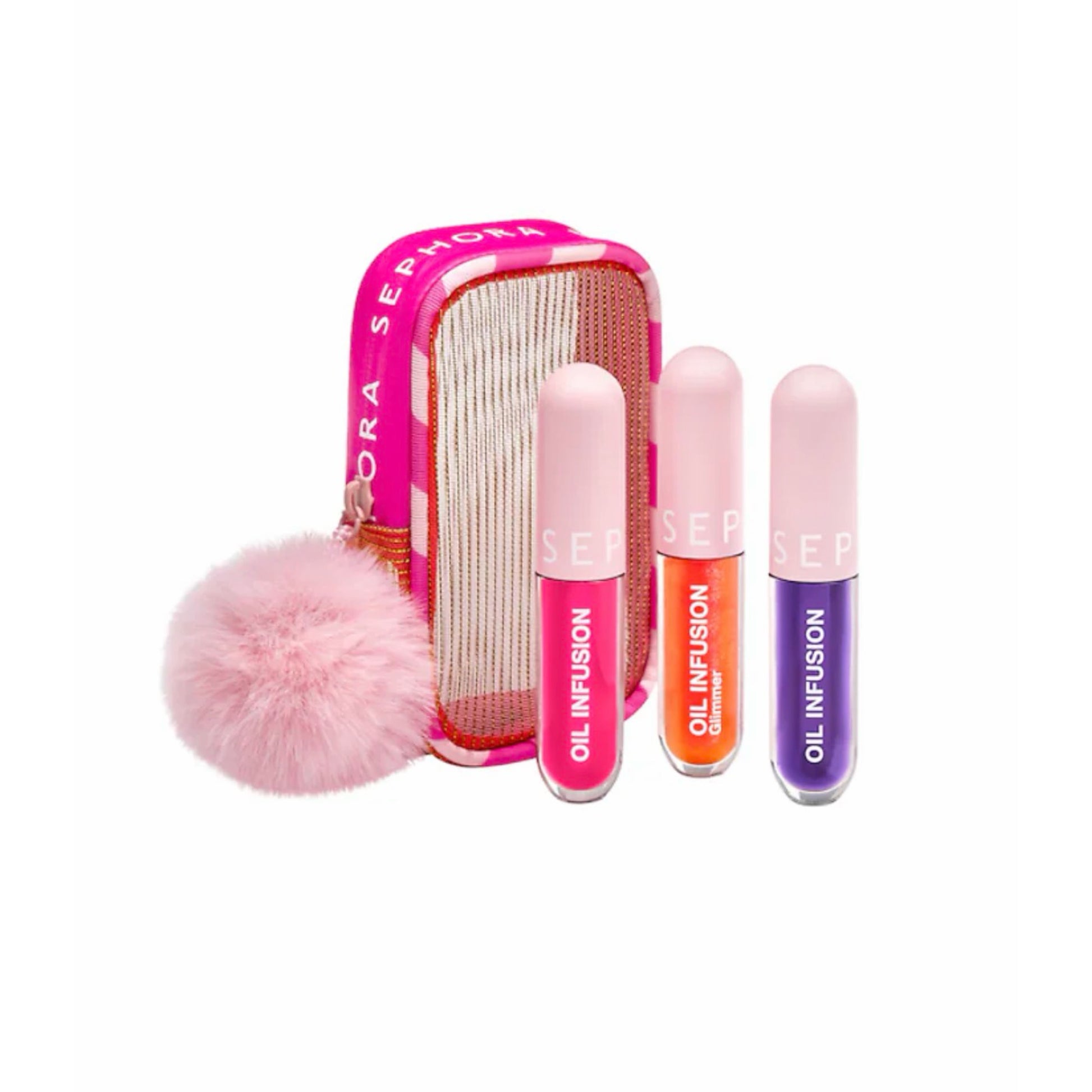 Hellita oma huuli selle Sephora kollektsiooni pühadeaegse Oil Infusion huuleõlikomplektiga. Kolm väikest, kuid ülitõhusat pakendit sisaldavad rikkalikke puuviljaseid aroome ja intensiivset niisutust, jättes huuled siledaks, pehmeks ja loomulikult säravaks.