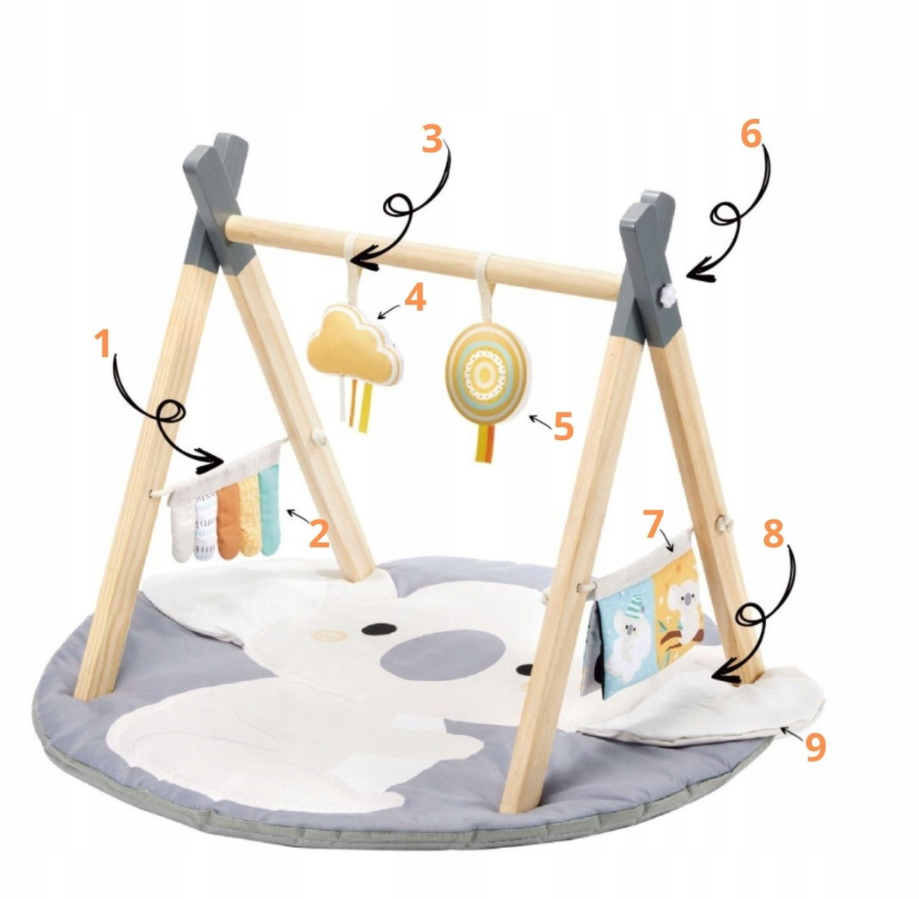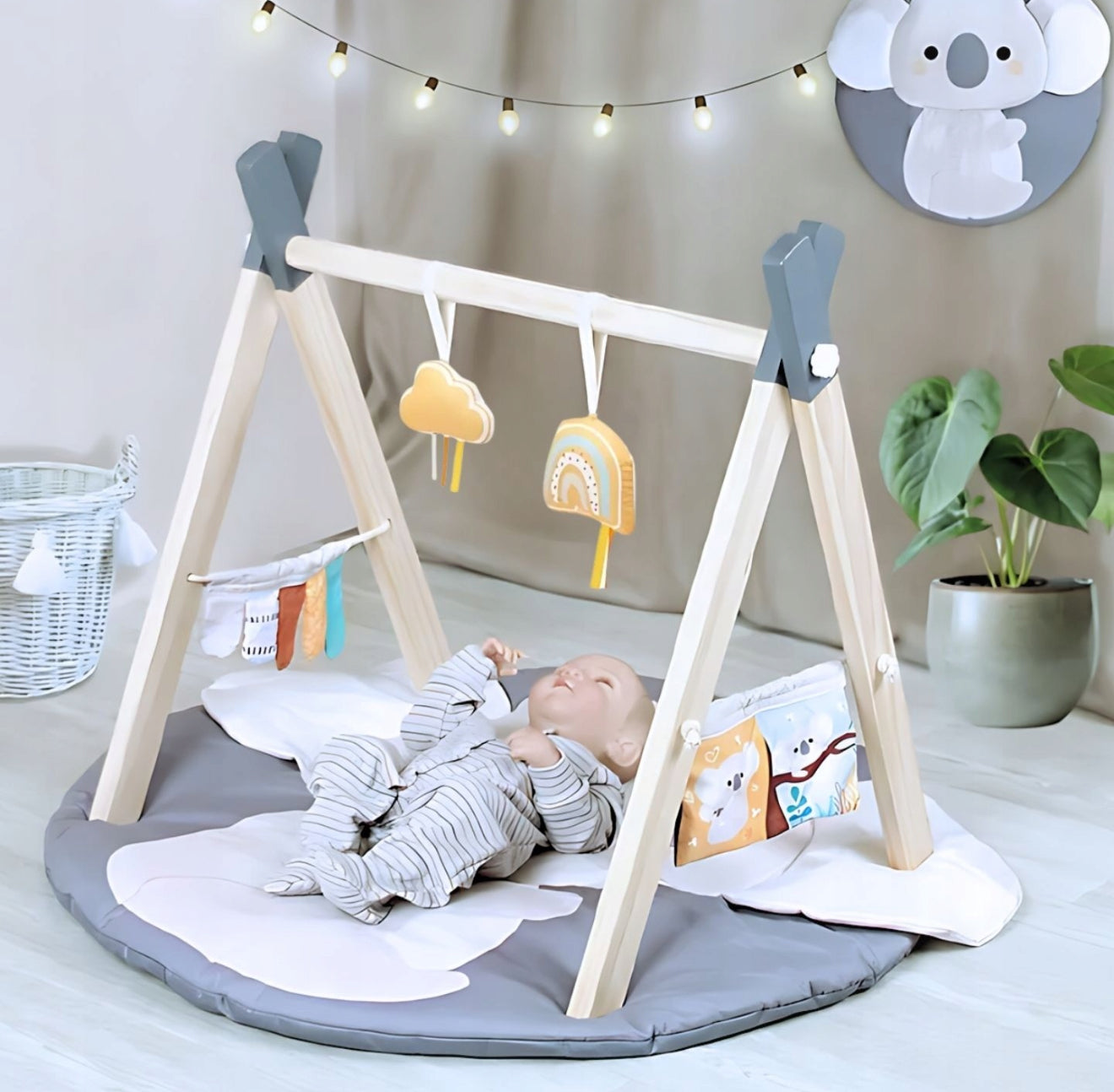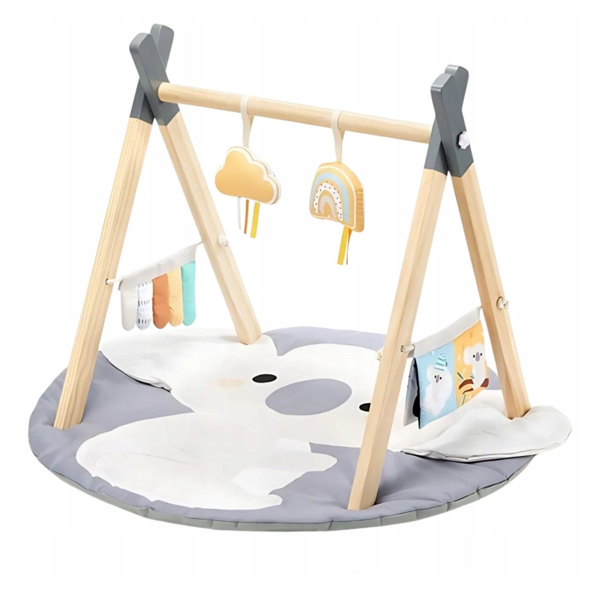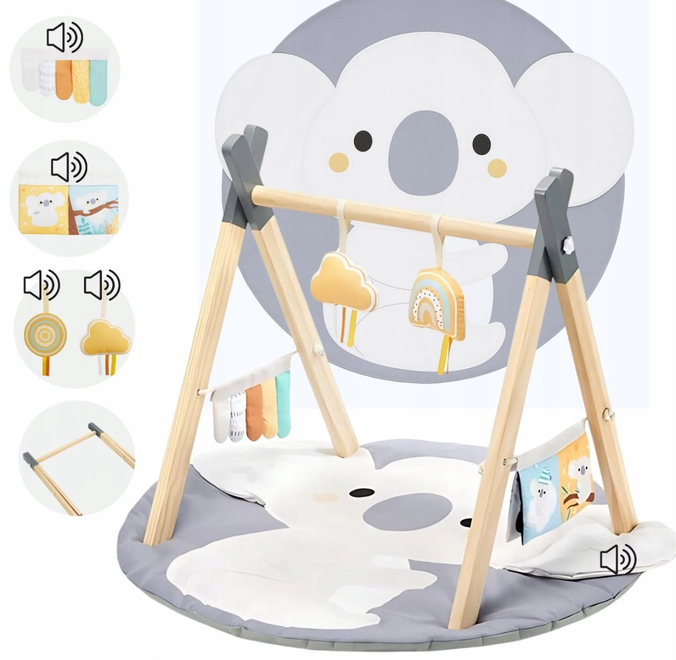 Hariv interaktiivne matt beebidele "Koala" puidust kaare ja mänguasjadega